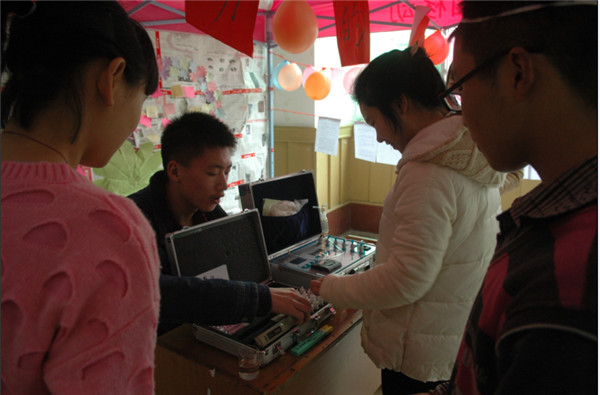 14:30,环博会准时开始。本次环博会主要由1个游览中心、5个环境主题会馆、2个协会特色部门以及1个绿色体验馆组成。轻轻文明、穹顶之下、荒化危机7Plus、小米的成长、生命之源等5个主题馆分别展示了噪音污染、大气污染、沙漠化、资源浪费、水污染等等五方面问题的危害、产生原因及应对措施。由学院志愿者协会义务检测部和公益服务部两个特色部门组建的跳动的心和爱心之家两个展馆则展示了近年来学院志愿者在为社区居民家庭进行空气、水质、重金属等等方面检测和在市社会福利院、市聋哑儿童学校关爱孤儿、聋哑儿童的成果。绿色体验馆展示了变废为宝手工艺制品的同时,让游客有机会亲手体验变废为宝的全过程。