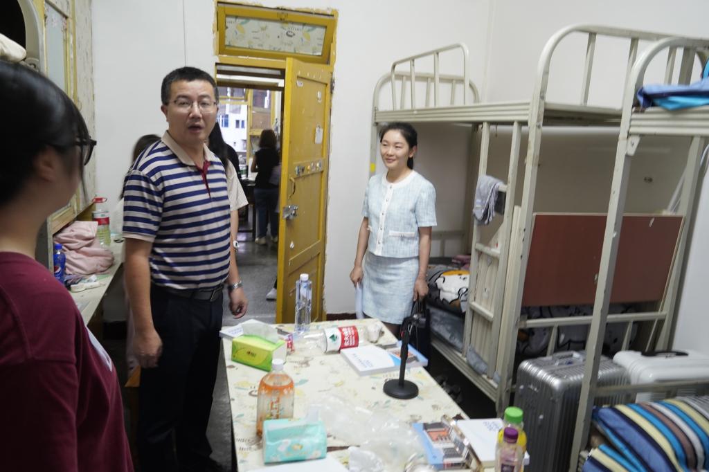 潘书记和向院长各带一组老师,分别走访了全院全部新生寝室。他们对新生们的到来表示热烈的欢迎,亲切询问大家来自哪里、对宿舍条件是否满意、入学以来适应程度、未来规划等。老师们给同学们提出了一些安全注意事项,提醒同学们安全用电,保持宿舍卫生,营造一个安全、干净、整洁的宿舍环境。叮嘱大家要提高安全防范意识,确保人身财产安全,谨防诈骗,同时希望大家能够互相包容、互相学习,增进对彼此地域文化的了解,从而营造积极向上的良好宿舍氛围。