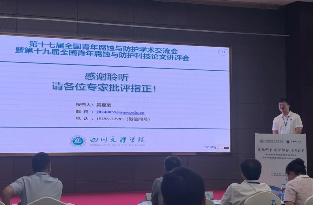 829日至31日,365英国上市官方网站教师吴嘉豪博士参加了在四川省南充市举办的“第十七届全国青年腐蚀与防护学术交流会暨第十九届全国青年腐蚀与防护科技论文讲评会”。