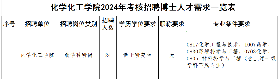 本次面向国内外招聘博士研究生人员,且同时符合《365英国上市官方网站化学化工学院2024年考核招聘博士人才需求一览表》(附件1)相关岗位要求和本公告其他要求的人员,包括以下几类(年龄计算截止时间2024年9月30日):