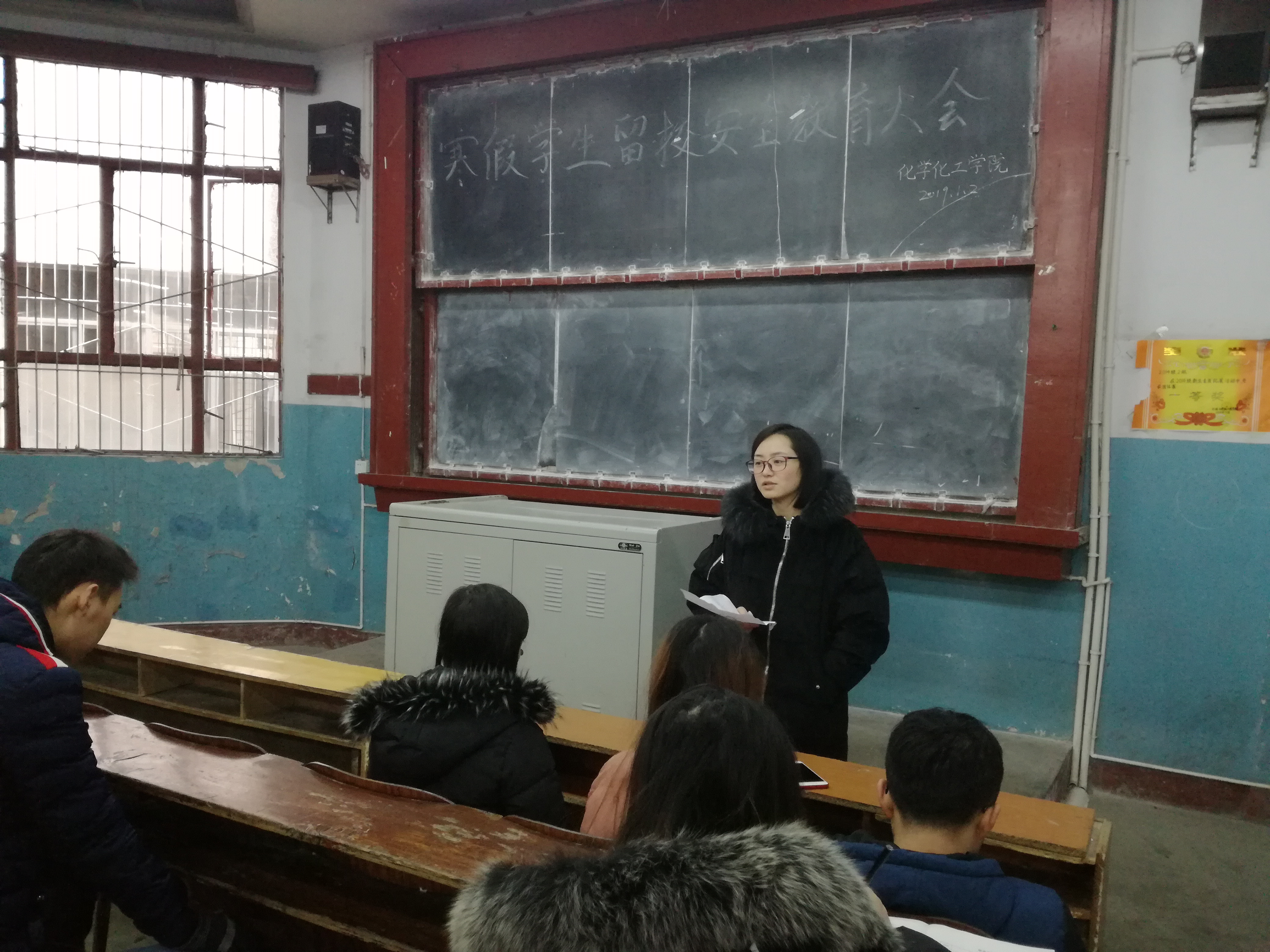 随后,付老师就学生寒假留校工作及注意事项做了具体安排,并对留校的同学提出了三点要求:第一,杜绝夜不归宿,禁止将校外人员带进学生宿舍,并且时刻和家人保持联系,让家人时刻知道自己的行踪;第二,学生应注意人身和财产安全,安全使用电器,做到人走电断,杜绝安全隐患;第三,注意防控流行性感冒、艾滋病等传染病,要注意饮食卫生,防止食物中毒。最后,付老师希望留校同学能合理安排假期的学习和生活,合理规划,提升自我,度过一个有收获、有意义的寒假。