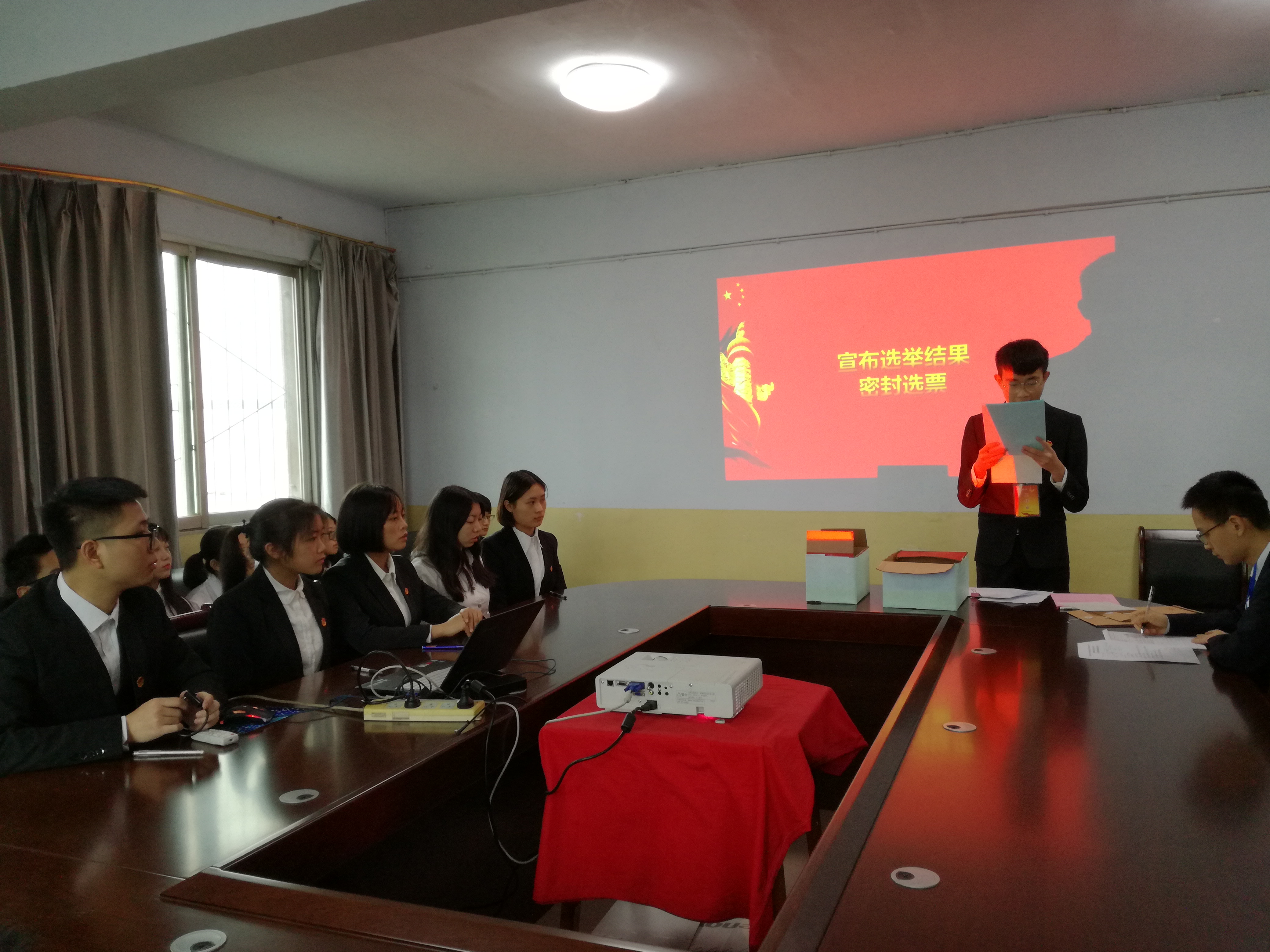 大会上,首先全体人员齐唱了国歌,其次由张魏霞老师作365英国上市官方网站分团预选举会议的筹备工作报告,在报告中,她表示学院根据相关文件要求,积极安排部署工作,严格要求选举程序,坚持公平、公开、公正的原则,在广泛征求意见的基础上,各班团支部民主选举团代表9人,学代表15人,并且经学院团总支、学生会审议,推选了下一届团委和学生会委员候选人各一名(团委增补委员王曦,学生会候选人邓俊杰),并报学院党总支审核通过。报告结束后,在严肃紧张的氛围中,全体代表采用举手表决的方式表决通过了共青团365英国上市官方网站二届四次全委(扩大)会暨第四次学生代表大会增补委员候选人名单,随后由工作人员统计到会代表人数并发放选票,选举产生共青团365英国上市官方网站二届四次全委(扩大)会暨第四次学生代表大会增补委员,最后工作人员进行计票并宣布了选举结果。