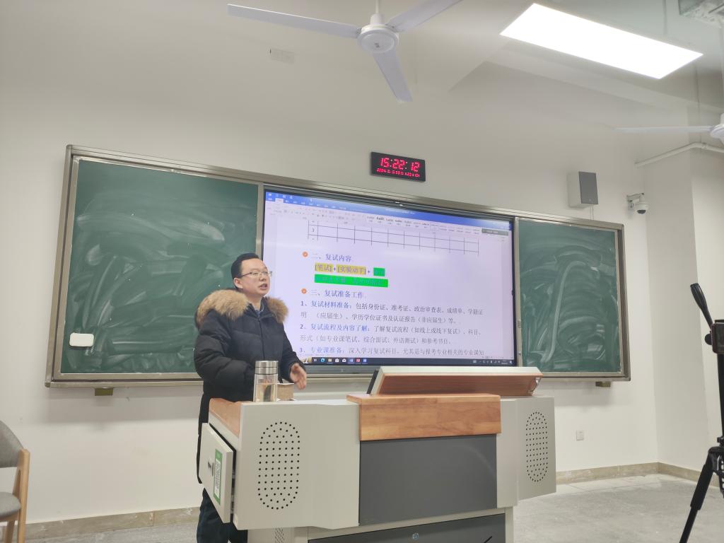 紧接着由王渝对复试与调剂进行自我经验的分享,从综合面试注意事项、自我介绍、邮件书写等方面进行了清晰有用的分享。最后由崔宝玉主任总结此次考研指导会的主要内容,并对考研学子给予了美好的期望。至此,考研复试指导会圆满结束。