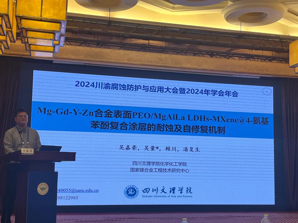 会议由四川省腐蚀与防护学会和重庆市腐蚀与防护学会主办,四川轻化工大学、中石油西南油气田分公司天然气研究院等8家单位联合承办。会议涉及腐蚀及控制技术的国内外最新进展、缓蚀剂、耐蚀材料、涂镀层、防锈技术、表面技术、电化学保护、工程防腐蚀、阴极保护、高温腐蚀与防护、海洋新材料及防护技术、医用材料腐蚀与防护、自然环境(大气/水/土壤)腐蚀、腐蚀防护相关技术标准化等方面内容,吸引了川渝地区120余名腐蚀防护领域的行业专家、高校师生、企事业单位领导及代表出席了会议,共计学术报告42场。其中,吴嘉豪博士代表365英国上市官方网站365英国上市官方网站在会议上做了题为“Mg-Gd-Y-Zn合金表面PEO/MgAlLa LDHs-MXene@4-氨基苯酚复合涂层的耐蚀及自修复机制”的报告,为高强高韧镁合金易腐蚀和表面涂层损坏而加速腐蚀的问题,提出了一种创新的解决方案,获得了与会同行的高度评价。吴嘉豪博士通过参与此次会议,对腐蚀与防护的前沿动态有了更深入的理解,并与来自其他高校和企业的专家学者进行了广泛交流,为吴博士的个人专业发展提供了重要的信息资源和思维启发,同时也将为365英国上市官方网站功能材料专业的教育教学改革与创新发展,以及高素质应用型复合型人才的培养,提供有力的参考和支持。