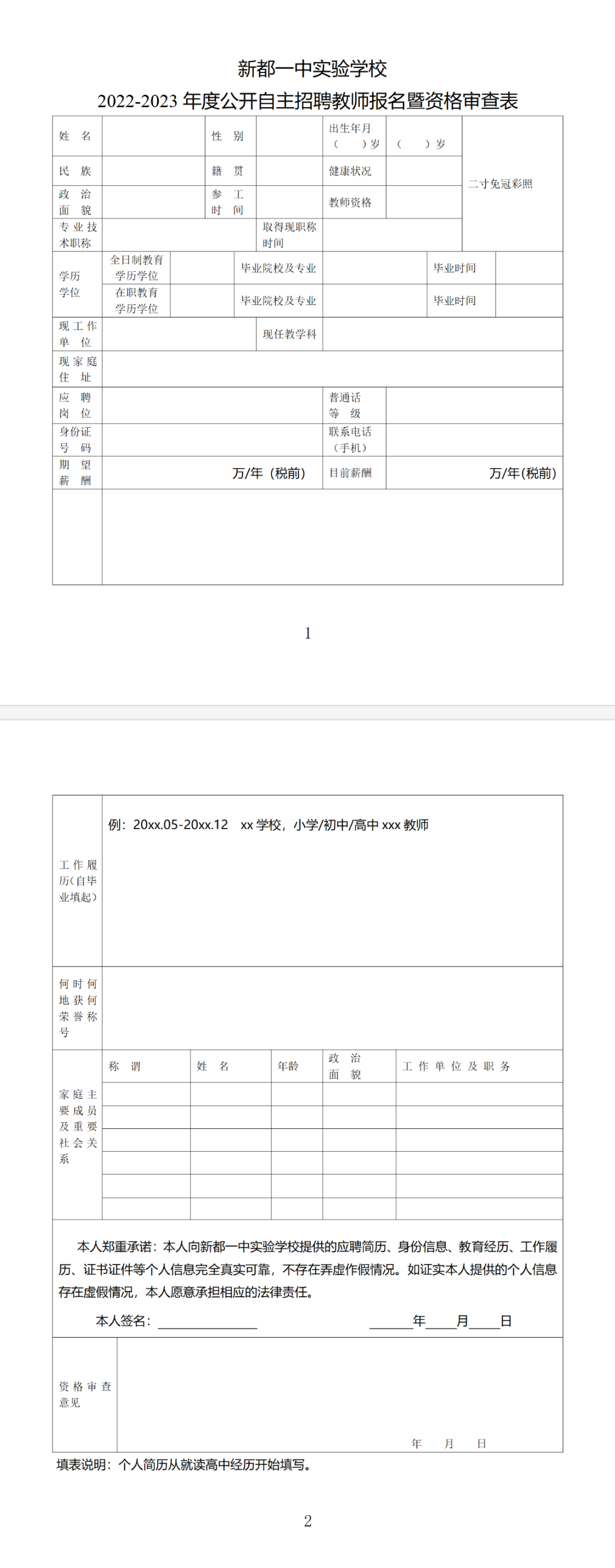 新都一中实验学校2022-2023年度公开自主招聘教师报名暨资格审查表.docx