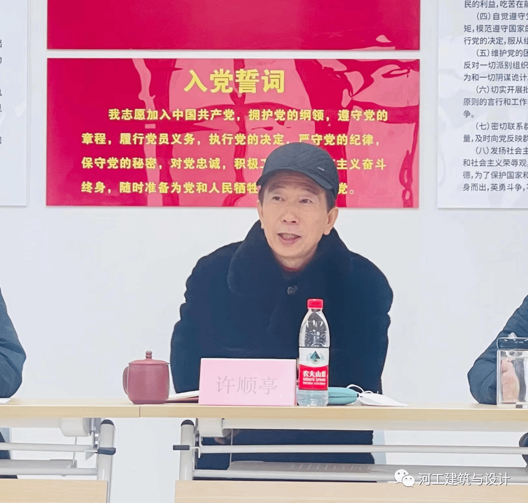 最后校党委副书记、董事长许顺亭提出五点希望:一是希望党员同志加强政治理论学习,有效结合教学内容,有机的将习近平系列讲话的重要思想引入课程。二是学校合格评估工作是目前的重点工作,强调了评估的紧迫性与重要性,希望党员同志结合评估指标主动考虑能为学校做什么。三是希望建筑与设计学院党总支能够在党建工作中抓亮点,出品牌,出特色,考虑党建工作如何通过物质载体呈现出来,如何讲好河工故事。四是希望教工支部同志发挥党员先锋模范作用去带动其他人的工作,同时要培养党员的荣誉感。五是希望同志们在工作中要敢于创新,勇于创新,善于创新,不要庸俗化。