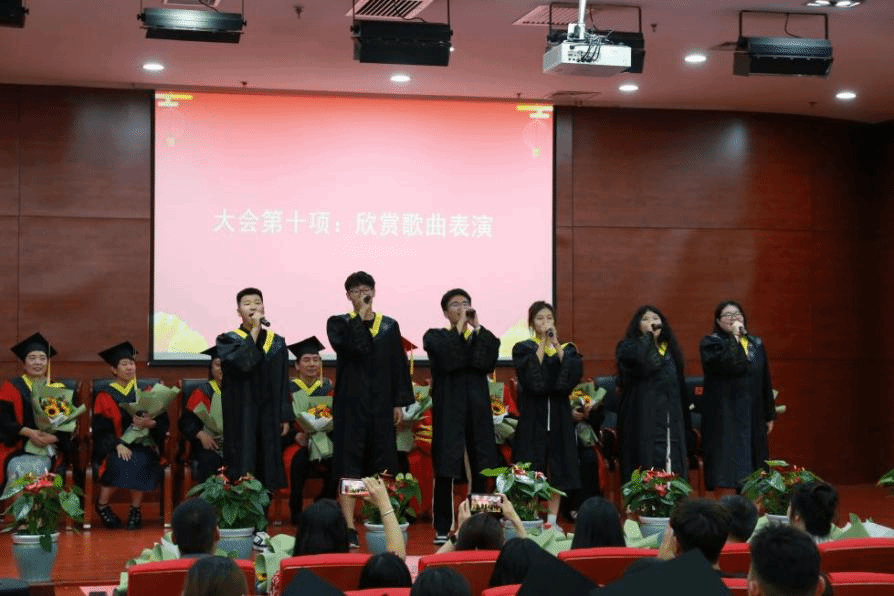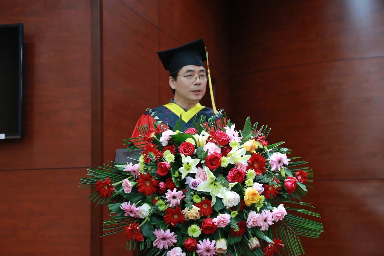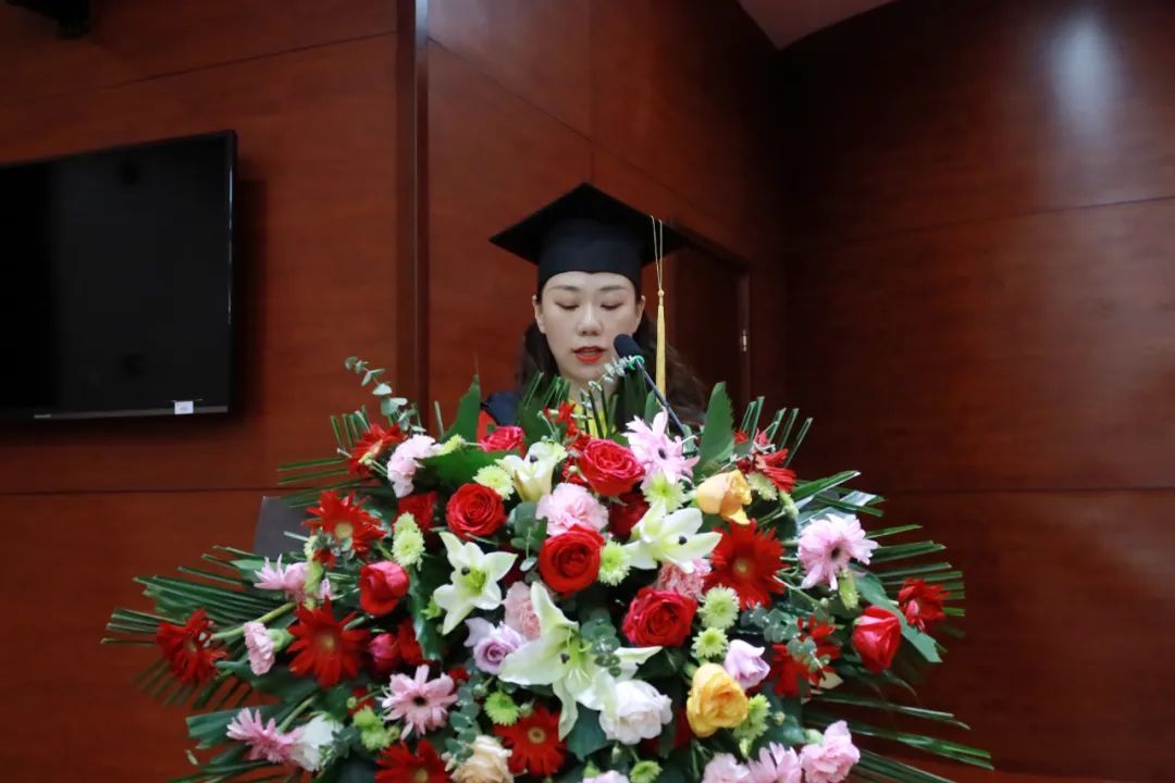 专职教师代表刘娟及辅导员代表张勇旗致辞,四年时光,同学们褪去了青涩懵懂,变得成熟独立。从宫北路 11 号走向人生下一站,你们为自己的青春交上来一份满意的答卷,而下一份答卷需要同学们在社会上,用几年、几十年的时间,去慢慢完成。告别了这一段明媚的青春岁月,愿你们走入社会后,仍然保持善良和真诚,牢记自己的初心,注重身心健康。