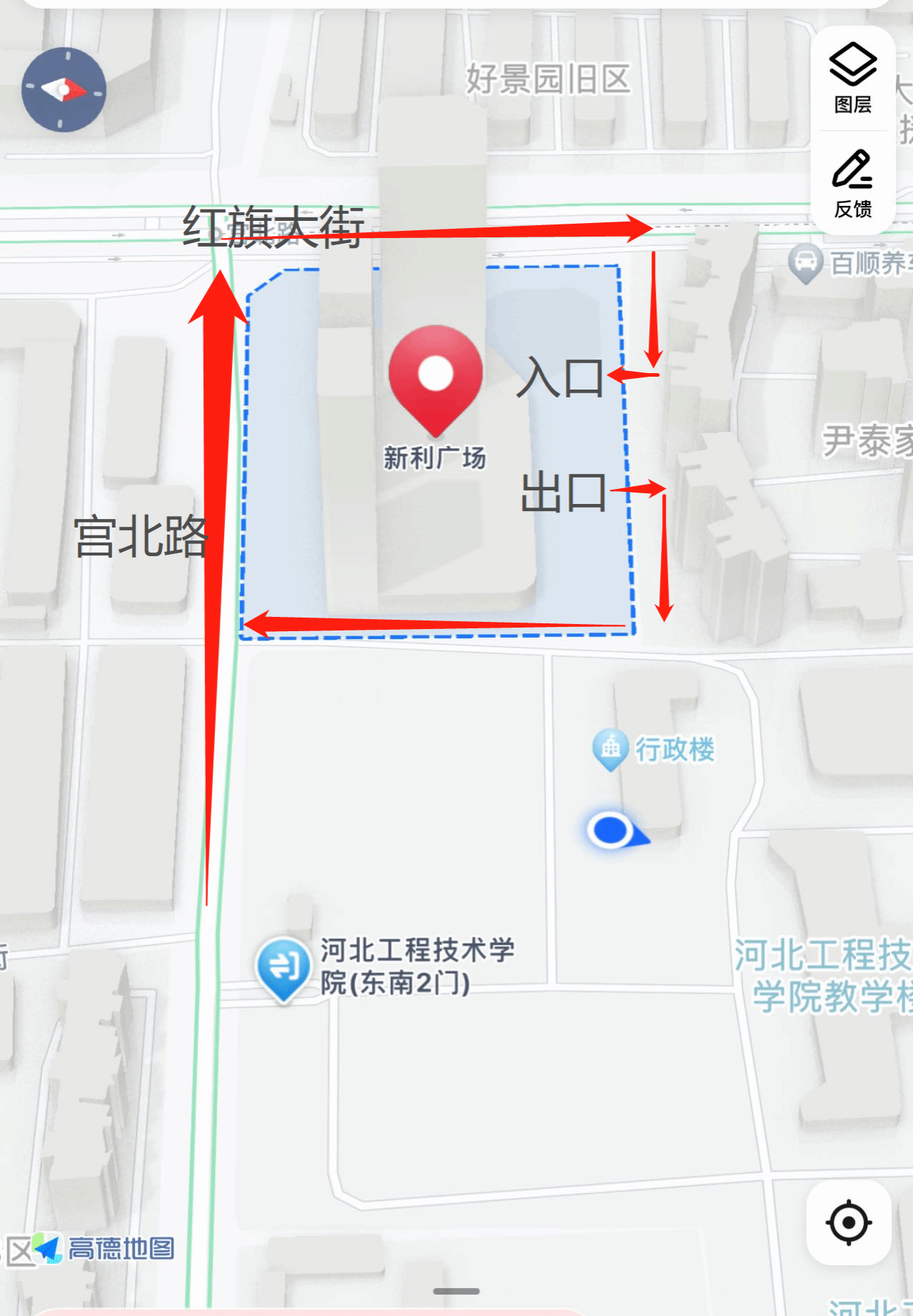 从滨河街驶入宫北路,按照箭头指示方向进入新利广场地下停车场入口。