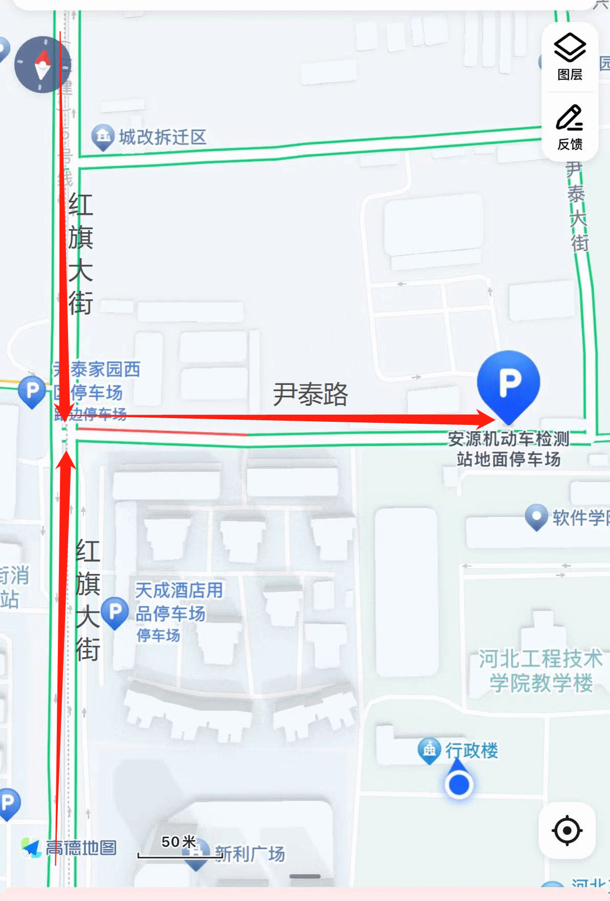 温馨提示:红旗大街与宫北路交叉口这段道路正在维修,日常车流量较大,易造成拥堵,建议从滨河街驶入宫北路