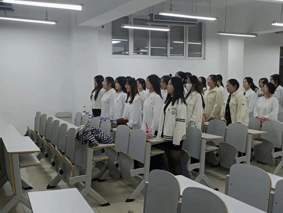 会议伊始,全体同学起立奏唱团歌。伴随着庄严激昂的旋律,同学们肃然起敬,歌声响彻整个教室。