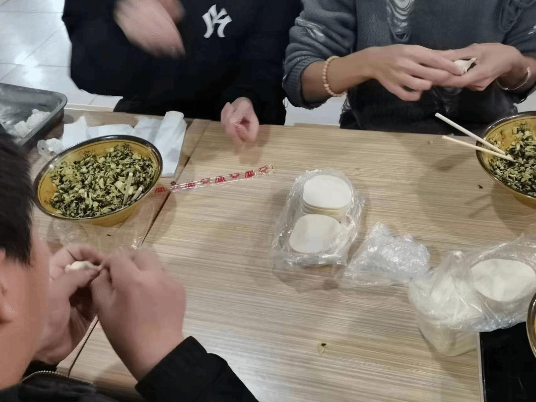 食堂的工作人员早早的就准备好了包饺子的材料,饺子皮和饺子馅儿。活动中,大家各自分工,协助动手。在包饺子的过程中,同学们聊起了冬至的来历和习俗。其中包括了张仲景医生来制作祛寒娇耳汤的故事,原来小小的饺子里蕴含着我国深厚的民族文化,同生们相互切磋包饺子的技巧,分享生活和工作中的琐碎日常,其乐融融,温馨欢乐的气氛油然而生。