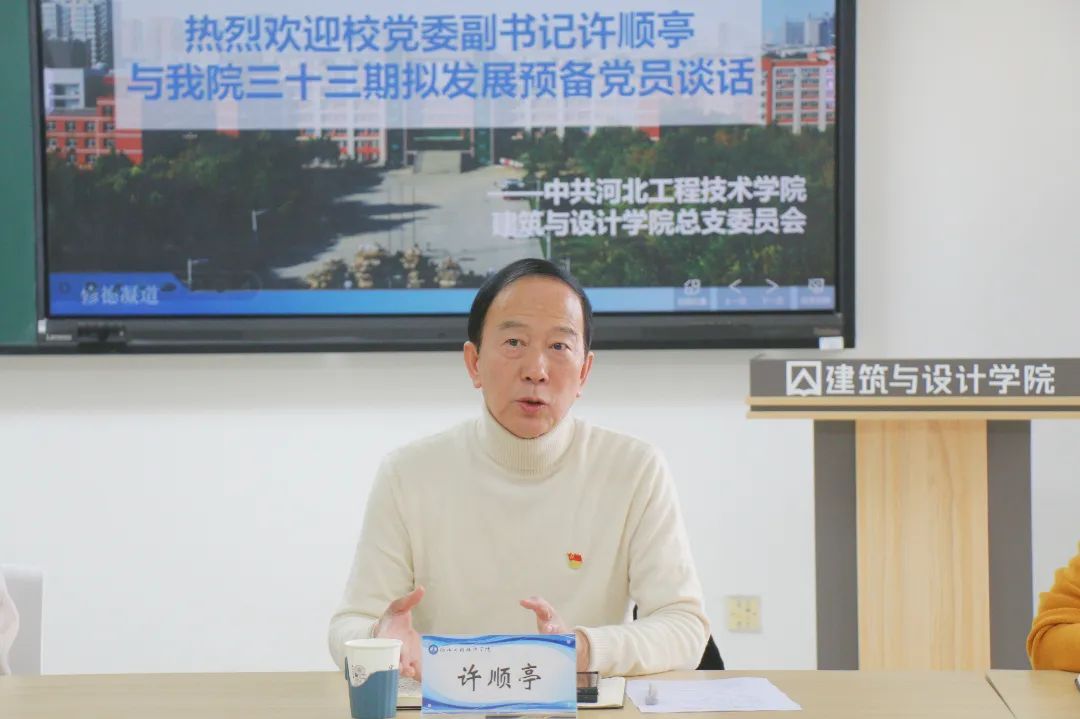 为进一步了解建筑与设计学院2023 年下半年拟发展预备党员的思想动态和入党动机,加强党员队伍建设,提高党员素质,2023 年 12 月 27 日下午 15点校党委副书记许顺亭于知行楼(主教)602 对我院第三十三期拟发展预备党员进行了谈话。
