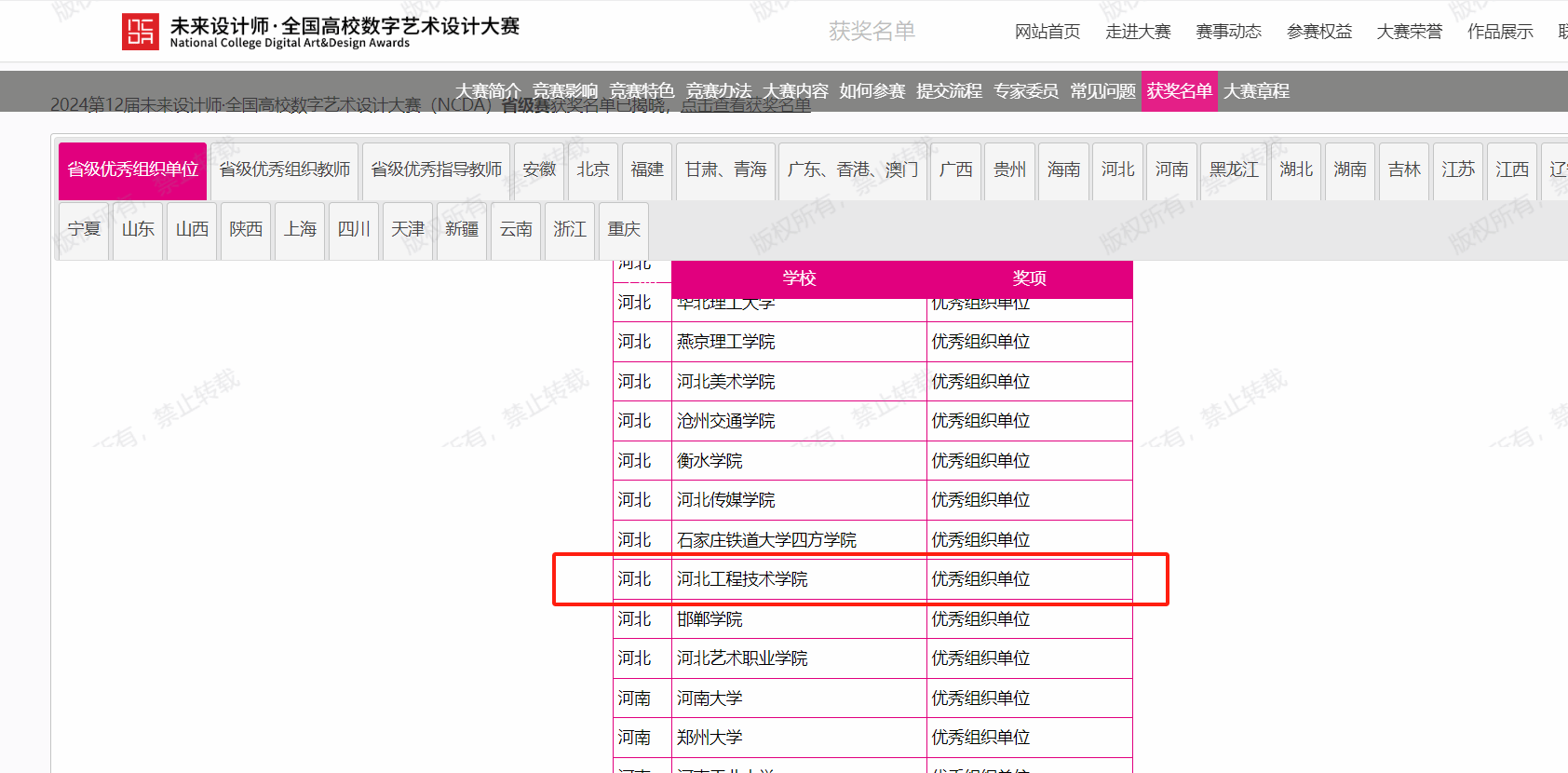近日,2024年第12届未来设计师·全国高校数字艺术设计大赛(NCDA)省级赛已圆满结束,pp电子游戏平台网站的师生们在此次大赛中展现了卓越的才华,以充分的赛前准备、夯实的专业基础、精彩的设计呈现在比赛中脱颖而出,荣获了3项省级三等奖的佳绩,学校获优秀组织单位。获奖名单如下: