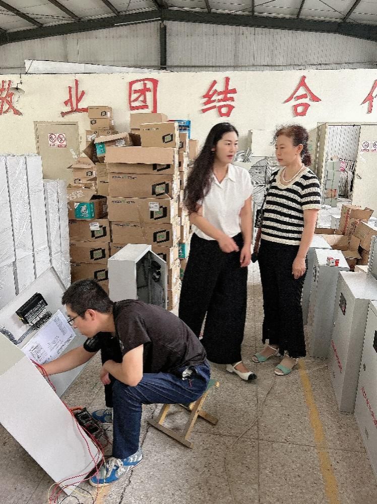 随后,在冯科伟总经理的陪同下,李伟娜副院长和钟爱琴系主任一行参观了计发电力的设备制造车间和电气安装调试车间。车间内,现代化的生产线、精密的检测设备以及忙碌而有序的工作人员给大家留下了深刻印象。钟老师近距离观察了电力设备的生产流程,并与技术人员就生产工艺、质量控制等方面的问题进行了深入交流。