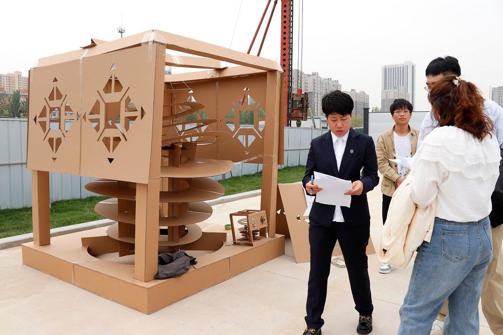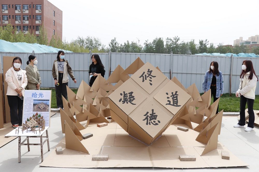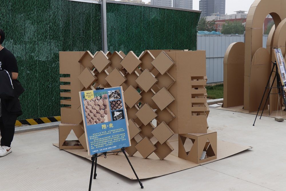 展览过程中,各组的作品模型在阳光下产生明显的光影变化效果。现场气氛轻松活跃,在各个队伍代表的积极讲解和答疑解惑下,参与师生们对空间形态的构造也有了不同的感官体验。