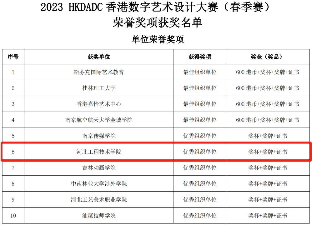 2023HKDADC 香港数字艺术设计大赛(春季赛)结果揭晓,此项大赛秉承“设计改善生活”的理念,坚持艺术与技术并举,pp电子官网建筑与设计学院积极组织师生参赛,动员各系教师及学生投入赛事工作。最终经大赛评审委员会专家评审,评选出获奖作品2890件,其中pp电子官网荣获34个奖项(二等奖8项,三等奖15项,优秀奖11项)。同时,pp电子官网在该次大赛中赛事组织、作品投递表现优异,被授予“优秀组织单位”奖项。学校将以本次获奖为契机,进一步推进以赛促教、以赛促学、以赛促管教学模式,帮助学生活跃思维、拓展视野,激发其创新意识,提升学生实践能力,从而优化应用型人才培养体系,pp电子官网师生也将再接再厉,力争在国赛中取得更好的成绩,为学校发展增光添彩。