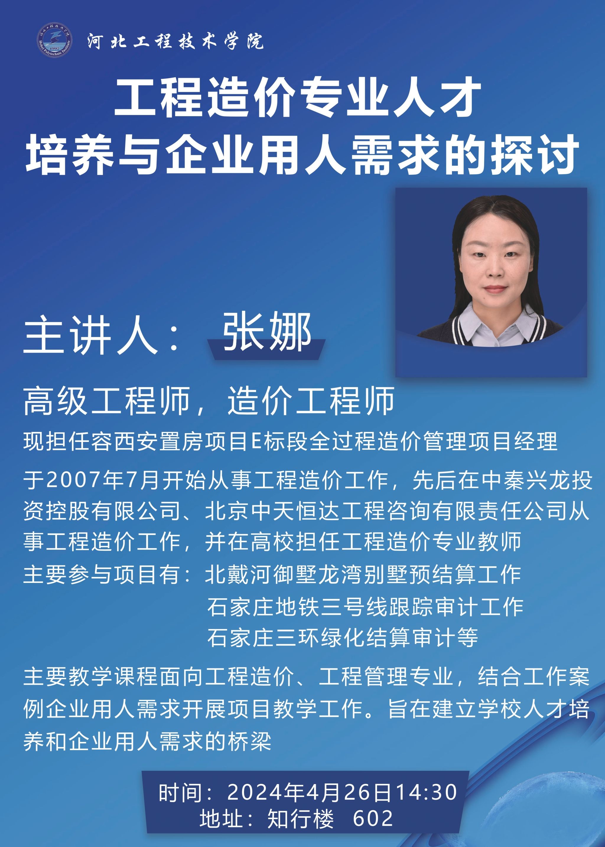 主讲人简介:张娜,女,高级工程师,造价工程师。现担任容西安置房项目E标段全过程造价管理项目经理。于2007年7月开始从事工程造价工作,先后在中秦兴龙投资控股有限公司、北京中天恒达工程咨询有限责任公司从事工程造价工作,并在高校担任工程造价专业教师。主要参与项目有:北戴河御墅龙湾别墅预结算工作、石家庄地铁三号线跟踪审计工作、石家庄三环绿化结算审计等。在校工作期间,主要教学课程面向工程造价、工程管理专业,结合工作案例、企业用人需求开展项目教学工作。旨在建立学校人才培养和企业用人需求的桥梁。