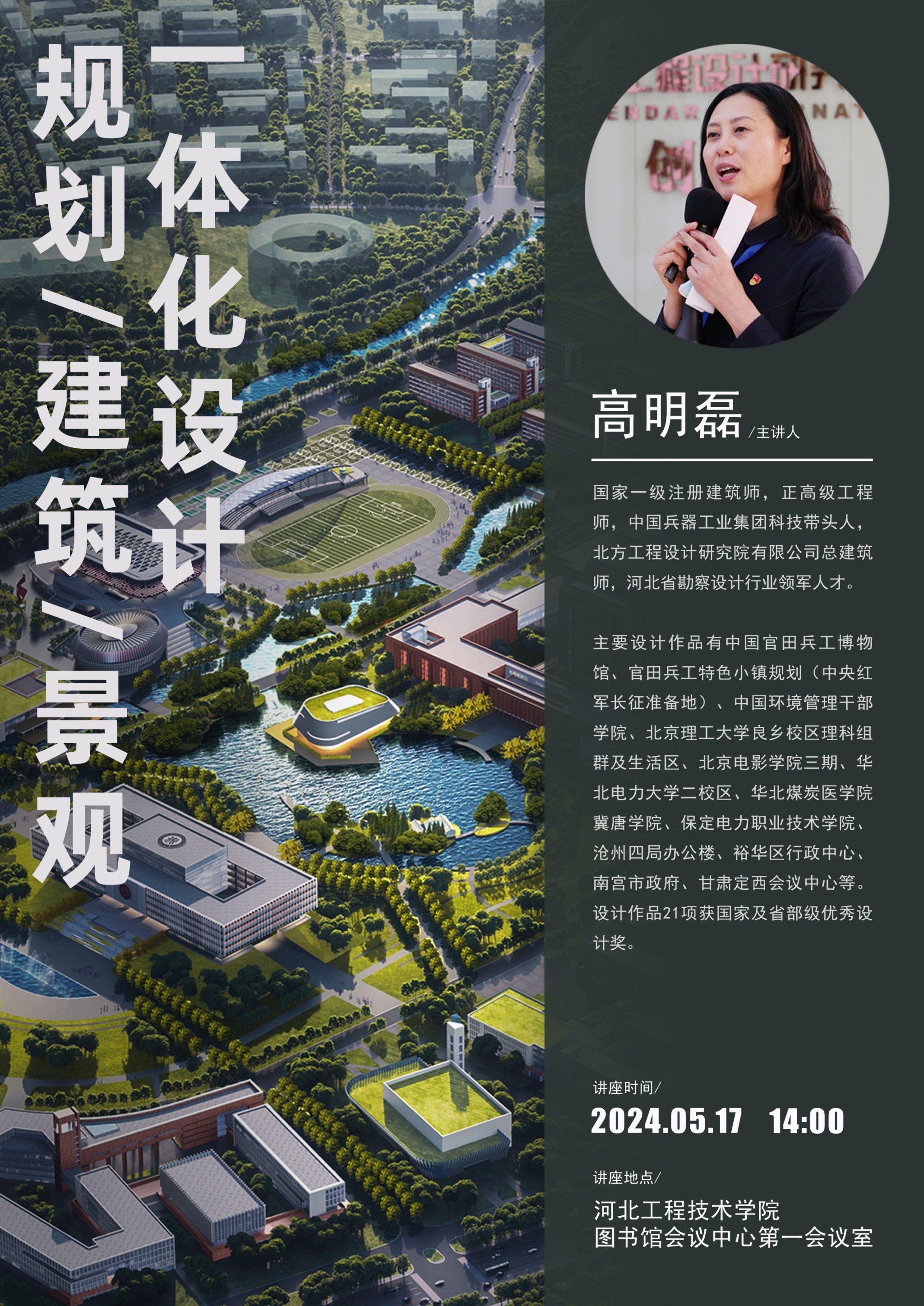 主讲人简介:高明磊 中国兵器工业集团科技带头人,河北省勘察设 计行业领军人才(勘察设计行业大师),北方工程设计研究 院有限公司总建筑师,国家一级注册建筑师,正高工(研究 员级高级工程师)。建筑设计一线工作经历,有百余设计作 品落地,主要设计作品有中国官田兵工博物馆、官田兵工特 色小镇规划(中央红军长征准备地)、中国环境管理干部学 院、北京理工大学良乡校区理科组群及生活区、北京电影学 院三期、华北电力大学二校区、华北煤炭医学院冀唐学院、 保定电力职业技术学院、沧州四局办公楼、河北省省政府、 裕华区行政中心、南宫市政府、甘肃定西会议中心等。