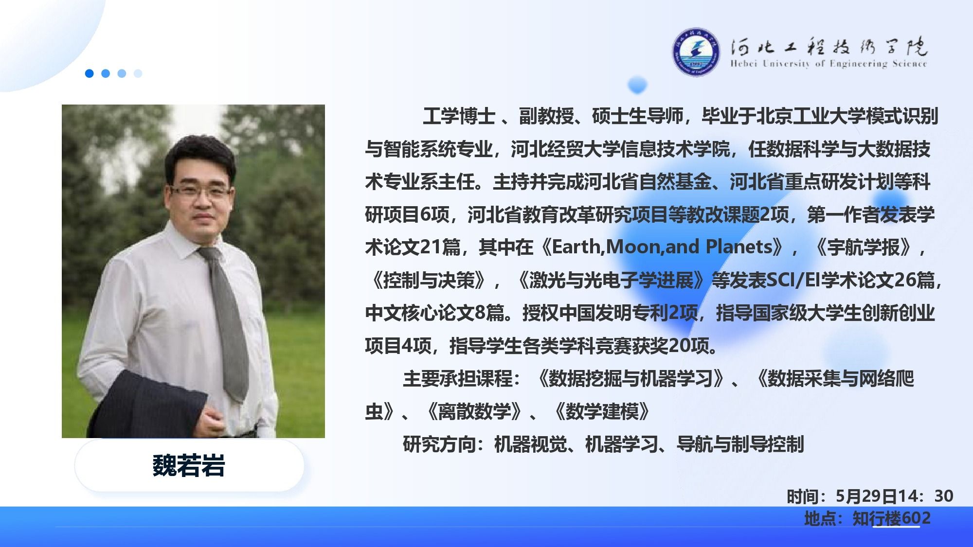 主讲人简介: 魏若岩,19843月,男,工学博士 、副教授、硕士生导师,毕业于北京工业大学模式识别与智能系统专业,现效力于河北经贸大学信息技术学院,任数据科学与大数据技术专业系主任。主持并完成河北省自然基金、河北省重点研发计划等科研项目6河北省教育改革研究项目等教改课题2项,第一作者发表学术论文21篇,其中在《Earth,Moon,and Planets》,《宇航学报》,《控制与决策》,《激光与光电子学进展》等发表SCI/EI学术论文26篇,中文核心论文8篇。授权中国发明专利2项,指导国家级大学生创新创业项目4项,指导学生各类学科竞赛获奖20项。