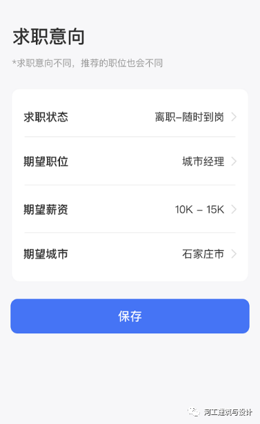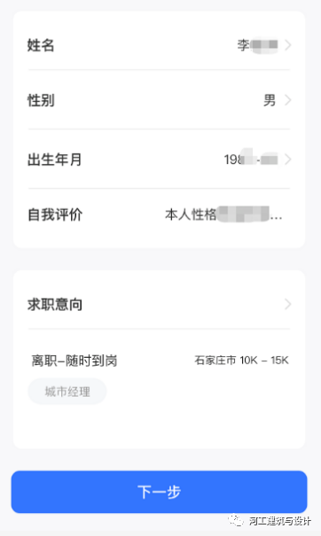 第三步:完善个人简历--个人信息、求职意向、教育经历等(简历完善的越完整越有助于找到心仪的工作呦),点击下一步--保存按钮,进入APP首页。