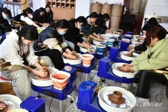 结束了陶瓷厂之旅后,在老师的带领下,我们又前往了以陶瓷为发展特色,结合旅游业与第三产业创新的陶瓷水镇,进行了更深层次的学习与研究。在这里,同学们亲自上手,在师傅们的引导与帮助下,感受到了泥土再手指缝隙间穿梭,又在机器的旋转与水的磨合中逐渐塑性,从一团没有形象的泥巴,肉眼可见变化为器皿的过程。