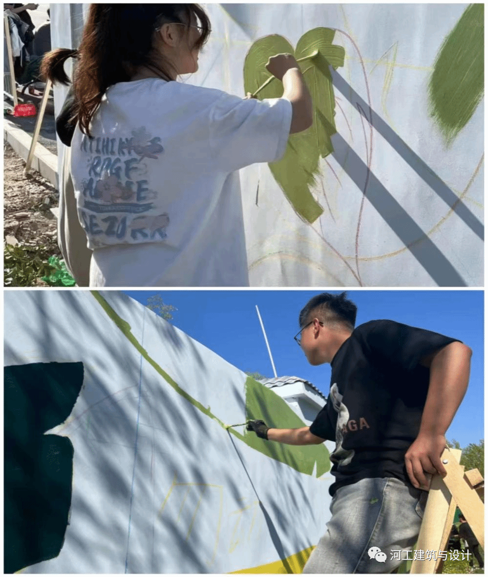 同学们在墙上描绘环境中的点点绿色;感受生活中的健康向上;