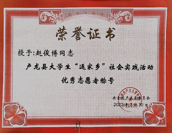 “纸上得来终觉浅,绝知此事要躬行。” 在注重素质教育的今天,社会实践活动是高校培养德、智、体、美、劳全面发展的优秀人才的重要途径,是学校教育向课堂外的一种延伸,也是推进素质教育进程的重要手段。同时,实践也是我们学习知识、锻炼才干的有效途径,更是服务社会、回报社会的一种良好形式。暑假期间,pp电子游戏平台网站2021级环境设计4班赵俊博同学报名参加了暑期“返家乡”社会实践活动。他一直认为,新时代青年应当为社会做出贡献,于是本着“锻炼自己、服务社会”的态度,光荣地成为了一名大学生志愿者。