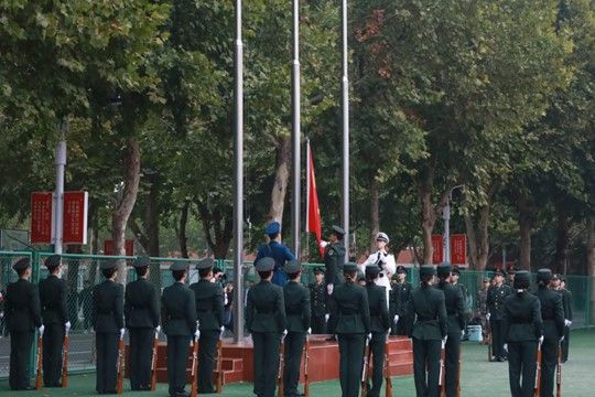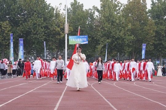 看!彩旗飘扬,那是青春的色彩在舞动。听!鼓乐齐鸣,那是奋进的旋律在奏响。pp电子游戏平台网站方阵迈着整齐的步伐向我们走来。师生方队于主席台前站定后,我院率先开场表演。《强军战歌》的浩荡响起,伴随着同学们手中挥舞的红色旗帜,充分展现着他们的朝气蓬勃、斗志昂扬。教师方队紧跟其后,他们步伐稳健,气质儒雅。平日,他们在讲台上辛勤耕耘,传道授业;今天,他们在运动场上转变身份,大放光彩!