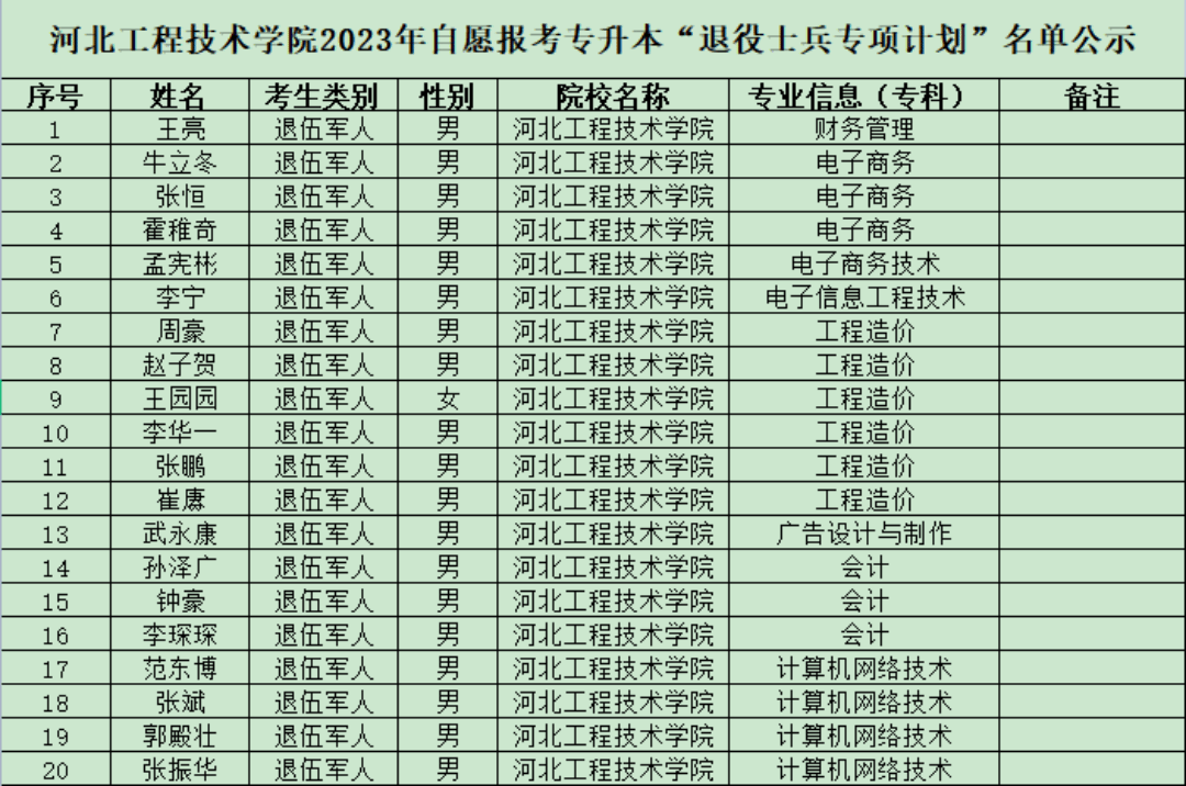 根据河北省教育考试院关于印发《2023年河北省普通高等学校专升本考试招生实施办法》的通知(冀招委办〔2023〕1号),pp电子官网对“退役大学生士兵”相关报名材料进行了资格审核,现将自愿报考专升本“退役大学生士兵”的考生名单予以公示。