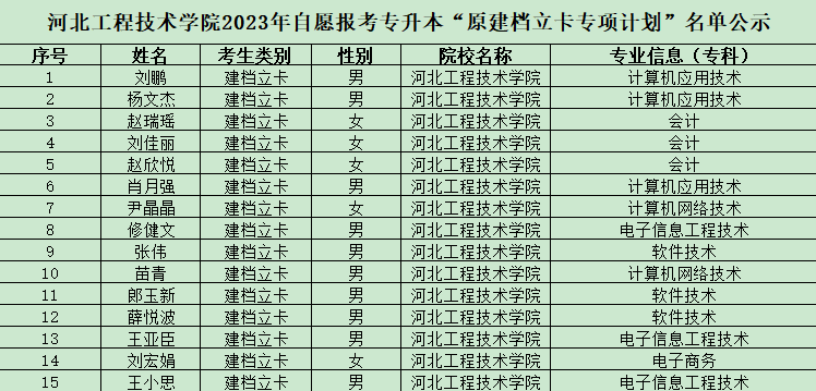 根据河北省教育考试院关于印发《2023年河北省普通高等学校专升本考试招生实施办法》的通知(冀招委办〔2023〕1号),pp电子官网对“建档立卡”相关报名材料进行了资格审核,现将自愿报考专升本“建档立卡专项计划”的考生名单予以公示。