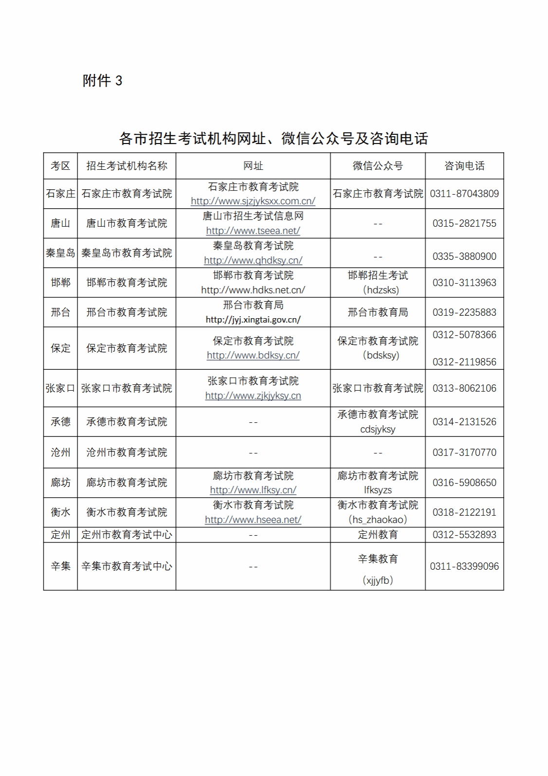 请考生及时关注河北省教育考试院官网(http://www.hebeea.edu.cn)、微信公众号(hbsksy)和考试所在地招生考试机构发布的相关信息,各市招生考试机构网址、微信公众号及咨询电话详见附件3。