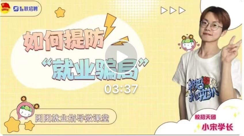 为进一步加强就业指导工作,提高大学生的求职技能,帮助大学生解决就业中遇到的难题,共青团中央青年发展部联合智联招聘共同推出的“团团就业指导微课堂”正式上线啦!和团团一起学习更多求职技巧,拿下理想offer吧!
