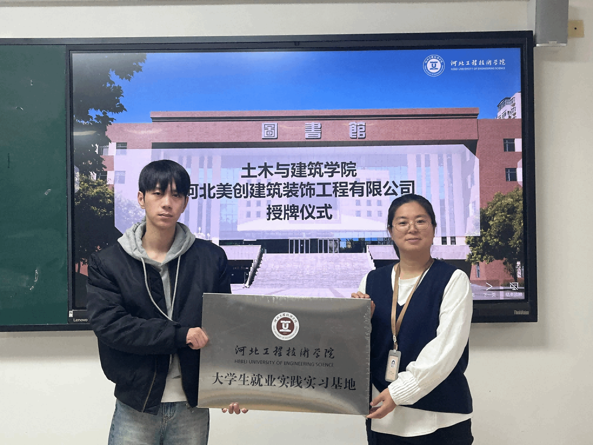 仪式开始前,张静向企业代表王坤详细介绍了学院的专业布局、人才培养特色以及学生就业现状。她指出,建筑装饰类专业着重强调“实践赋能”,此次合作将为学生搭建起从课堂理论通向行业实操的桥梁,有助于学生掌握施工工艺、装饰设计等核心技能。企业代表王坤代表企业表示,河北美创装饰在建筑装饰领域深耕多年,拥有丰富的项目资源和专业的技术团队。企业期待通过实习基地为学生提供施工现场管理、软装设计等岗位的实践机会,同时也希望吸纳更多专业基础扎实的毕业生加入团队。